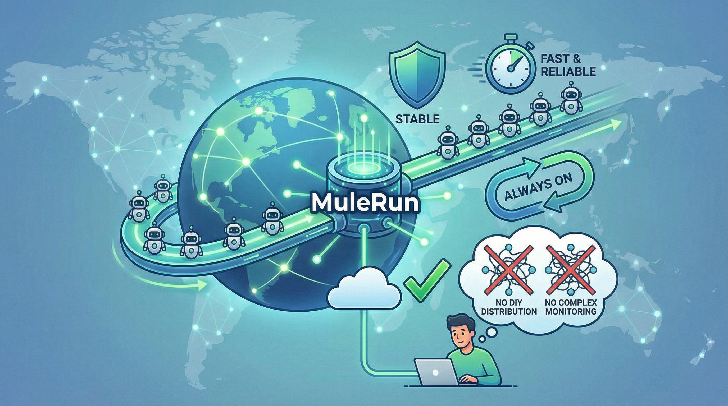 For a global platform like MuleRun, ensuring that thousands of agents can be accessed stably and quickly by users worldwide is a massive technical challenge.
